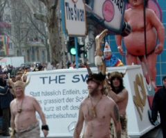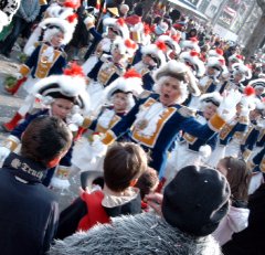 Well ... there is a song, a famous one: "Ole ole fiesta, fiesta here at the Rhine, can be as nice ... as nice ... as at Rio Grande." (very free translation - it is German Portuguese or Spanish mixture). If thinking about Carneval the world looks to Brazil, to Rio and Bahia, thinking about Samba, hot rythm, hot costumes and hot nights. The problem here is, it is cold, usually between -3 and 10°C, depending on the weather. Nevertheless there are few tough guys ignoring this and running round naked the full four hours of the parade.