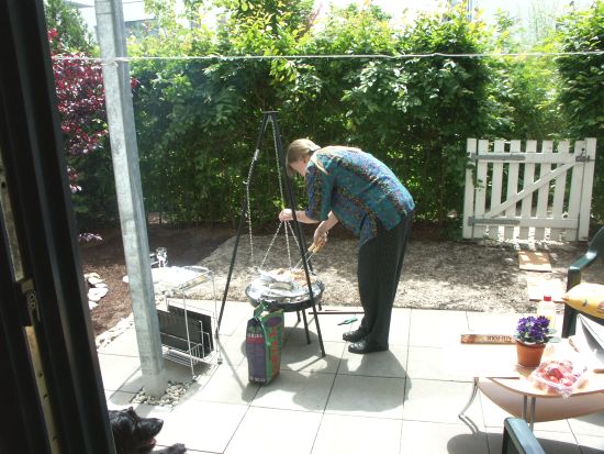 And my friend busy at the fire place. The former people left the grill there for us ... a nice gift :-) The space behind the terace is not yet ready. Some lawn shall grow there in the future, but the seeds have first to develop.
