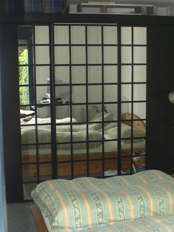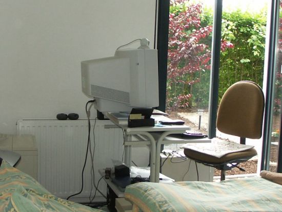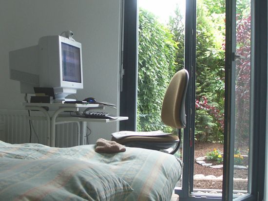 Since we need two computers my workplace will als be in the bedroom next to the garden door. Comparing to my former room I enjoy the light in the new appartment. The large doors and the garden towards the South let much light in. And the mirror closet in the bedroom reflects it.