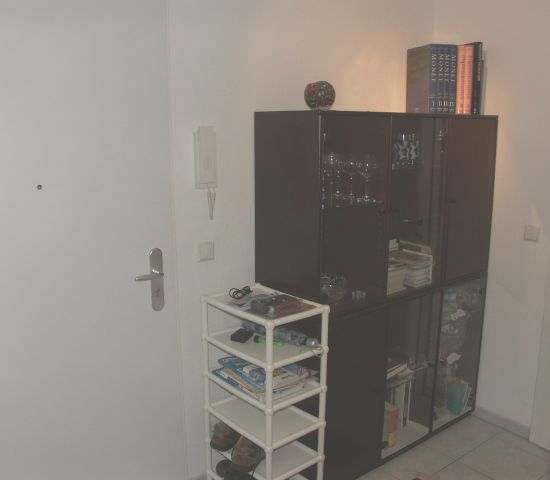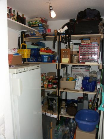 The red vitrines from my former living room moved to the little hall now. A wonderful thing is the little storage room. My dad and me worked hard to make from the wood of my loft-bed a big shelf. It can be used now to put a lot of things in.
