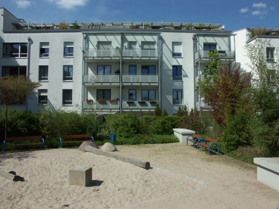 | The appartment is part of a larger housing area, which is built around a large court. In the court is space for parking the bike under a lockable cage even with roof for rain protection. There are the big waste bins and several playtgrounds for the children like the one here. Our garden is just under the balcony in the middle. It's not very big ... about 5 x 7 m but enough to sit outside, stay with friends, make a barbecue or grow a few herbs, flowers and other little plants. The first challange however was to get all the things there from the old appartment and buy new furniture for the rooms. |