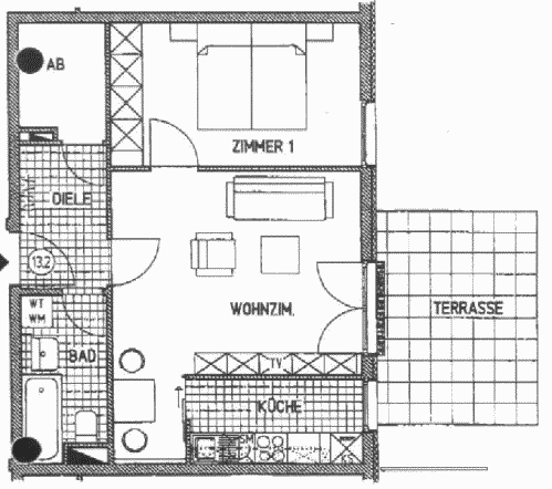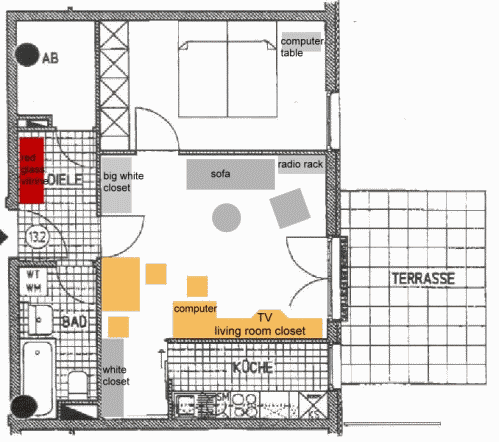 | The sketch above was from the house construction company selling the appartment and we had to think over and vary the furniture. From my old appartment I had no shelf really suitable for the living room and also no big closet for the bedroom in which would have been enough space for the clothes of Leticia and me. |