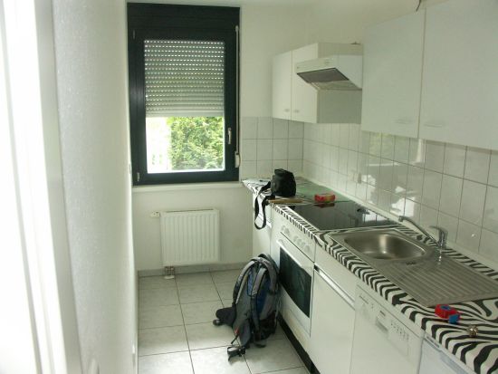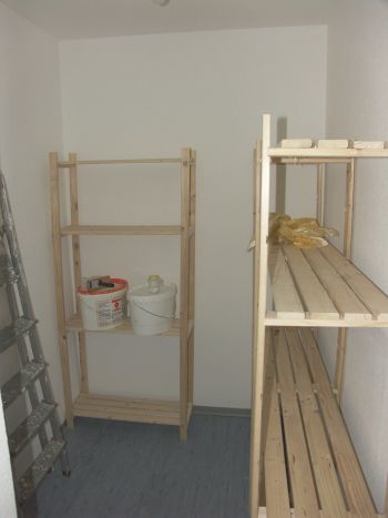 | And a storage rooms where the former couple left two shelfs. In the first days in mid May after getting the keys I had first to paint the walls a bit. But the state was not really bad. In the kitchen the ceramic cooking field was broken and the oven was really messy. That's why we decided, after getting a good offer together with a washing machine, to buy a new one. A nice thing, which was already in was the little dish-washer. We used it when my parents came for helping for a few days. For myself it's not necessary but I guess together with Leticia we will cook more and it will become useful. |