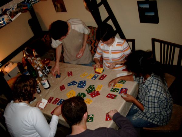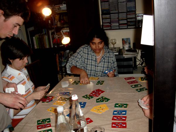 Ligretto is very easy cared game, but you have to be very quick. There are four cards in front of you, three single ones and 1 as upper card in a pile of ten. You lay color on color and 2 on 1, 3 on 2, 4 on 3 and so on. And you try to get rid of your pile as soon as possible if the first 1 of a color is on the table. People all try to put their card very quickly on the pile where they fit. But very often two people have the same card and only the quickest can get rid of it. It is a funny game.