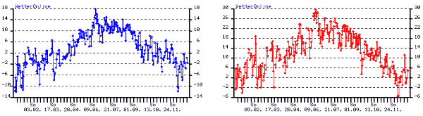 | Minimum (blue) and maximum (red) temperatures in Virgen are shown above in °C for the year 2002. 2003 was unusually hot in Europe and not representative. The climate is typical for the southern side of the main chain of the Austrian Alps, called "Hohe Tauern". While the parts in the North usually get more rain, the south is more sunny and little warmer. Often the high mountain peaks are in clouds but the rain does not make it to the southern side and goes down in the valleys in the North. |